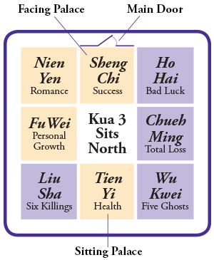 八宅風水の法則で運気を高める 八卦・八宅 2018/05/232019/02/15 八宅は、個人の吉凶方位を示す「クアナンバーの法則」だけでなく、建物の吉凶がどこにあるのかを調べるためにも使うことができます。この法則では、全ての建物が8種類に分類されます。 家の中のどの方角に4種類の吉運と4種類の凶運があるかを示すのが八宅風水チャートです。あなたの家の玄関の方角と背中(玄関と反対側)の方角がわかれば、8つの中でどのチャートを使えば良いのかがわかります。 コンパスを使い、正しく方位を測り、8つの中からチャートを選び、間取図にあてはめ、吉と凶がどこにあるのかを調べるのです。 4種類の吉運 とは: 1.Sheng Chi(生気):繁栄、成長、拡大、成功、富。 2.Nien Yen(延年):結婚、人間関係、恋愛、家族。 3.Tien Yi(天医):健康運、幸福、自由、病気。 4.Fu Wei(伏位):自己成長、増進。 4種類の凶運 とは: 1.Ho Hai(禍害):軽い凶運、事故や事故に類すること。 2.Wu Kwei(五鬼):あなたに危害を加えたい人々 3.Lui Sha(六殺):6種類の不運 4.Chueh Ming(絶命):全損と深刻な不運 例: 玄関が南にあるの家の場合: 南-Sheng Chi(生気)が成功運をもたらすので、水を飾り、パワーを高めると良い。 南東-Nien Yen(延年)が恋愛運をもたらし、この運は非常に強く影響する。 東-Fu Wei(伏位)が自己成長の運をもたらす。木の気が強すぎてしまうので、この場所にあまり植物を飾らない方が調和する。 北東-Lui Sha(六殺)は水の性質の不運で、土の方位である北東にあるため、弱い。六殺は抑えられていると考えて良い。 北-Tien Yi(天医)の健康運は土の性質のエネルギーで、家の「座」、つまり背中にあたる場所にある。北は水の方位なので、この吉運はあまり強く作用しない。火のエネルギーをあらわすものを飾ると運気を高めることができる。 南西-Ho Hai(禍害)は土の性質の凶運で、同じく土の方位である南西にあるため非常に強い。金を飾り、不運を弱めると良い。 西-Chueh Ming(絶命)は金の性質の不運で、同じく金の方位である西にあり、非常に強い。水を飾ると不運を抑えることができる。 北西-Wu Kwei(五鬼)は火の性質の不運で、金の方位である北西にあり、衝突している。クリスタルなど、土のエネルギーを使い、バランスをとり、弱める必要がある。 例と同じように、次の中からチャートを選び、ご自宅の間取図にあてはめてみてください。 関連する記事 誰でもできる 八宅風水の法則 結婚運を左右する3つの方角 霊的な風水を整えてパワーアップする 死者の日に行う「清明の儀」 絶命を克服してV字回復した風水の話