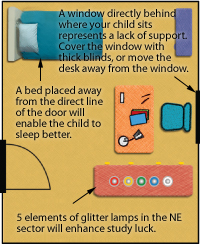 子ども部屋風水の基本 学業風水 2022/09/202025/04/22 子どもがすこやかに成長し、いつも元気いっぱいでいてほしい、そのために風水は重要です。 図上)子供用ベッドのサイズが十分かどうか、確認してください。十分な大きさのないベッドで寝ると、発育の障害になる場合があります。 中)学業運を得るには、勉強机は部屋の中で「パワースポット」に配置する。 下)勉強中に顔が「伏位」の方位に向くようにする。 子どもの寝室の陰陽のバランスは、「陰」よりも少し「陽」に寄った状態が望ましい、これが風水の基本です。 明るく、賑やかな方がよい、という意味です。 怖そうな絵や写真、獰猛な動物の人形などは寝室に飾らないようにしてください。 ベッドと勉強机を間違って配置すると、子どもの健康状態や、学校での素行に問題が起きやすくなります。 子どもにとって、勉強机に向かう時に顔が向く方位と、寝る時に頭が向く方位、この2つが、風水で重要です。 子どもには、吉方位の中で「成長」がベスト ベッドは、頭が「成長」の方位(クアナンバーの吉方位4番目に表示される)に向くように配置するのがベスト。 お金を稼ぐ仕事をしているわけではないので、「金運」の方位に向く必要はありません。 健康運と学業運を高めるようにすればいいのです。 勉強机では、なおのこと、勉強中、宿題をするとき、顔が「成長」の方位に向くようにするとよい。 勉強部屋のレイアウト 図上)吉方位を向くからといって、このように机を配置してはいけません。壁に向くのではなく、壁を背にするのが風水の良いレイアウトです。 下)イスの背面に窓、ドアがあるのはNG 勉強部屋にすごく近い場所に、伸び盛りの木があるのはNG。睡眠中に必要な「気」が、夜の植物の光合成(酸素を吸い二酸化炭素を出す)によって奪われ、勉強に集中する妨げとなるからです。 突き出たエアコンや部屋の梁(はり)の下には座らない。 突き出た柱の角やたんすの角が勉強机に向かないように 寝室に扉のない書棚を置かない ドアと窓の間には勉強机を配置しない 家の北東の場所が、トイレや物置、キッチンなどがあることによって不運の原因となっていないか確認すること。もしそうだとしたら、不運を受けているのが土の性質を持つ方位北東なので、6ロッド式のウィンドチャイム で「金」のエネルギーをつくり、「土」を抑えるようにしてください。 学業運を高めるには 図上)勉強机に座ったとき、真後ろに窓があると、周囲から協力が得られなくなる。少し場所をずらすか、しっかりとしたブラインドでカバーすること。 中)入口ドアのある壁にベッドをつける場合は、ドアから遠い場所の方が熟睡できる。 下)勉強部屋の北東に五色のランプ照明をつけると学業運を高める さらに学業運を高めるヒント 部屋の北東にあたる場所にはクリスタルの地球儀を飾り、朝・昼・晩それぞれ1周まわす。 デスクに龍の門にジャンプするコイを飾ると試験運が高まる。 子どもにクリスタルポイントをプレゼントする。勉強中は机の上に、寝る時には枕元に、試験の時には持参するように勧める。 関連する記事